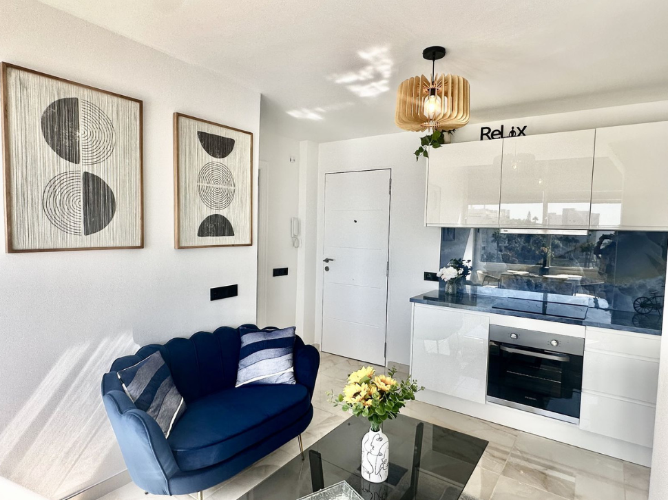 • W pełni wyposażona nowoczesna kuchnia z blatem i panelem ściennym z wysokiej jakości porcelany