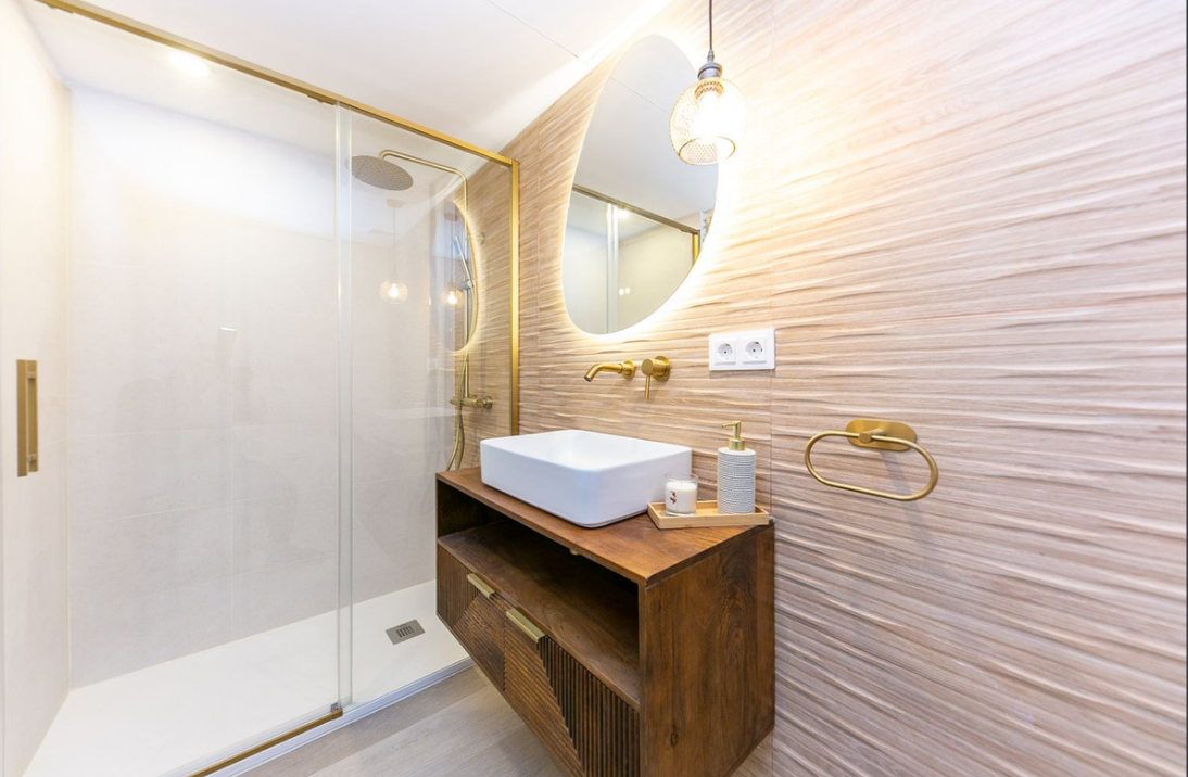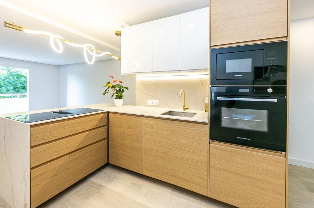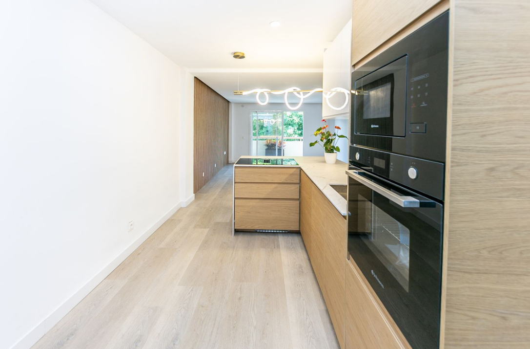 Kuchnia jest w pełni umeblowana i wyposażona w nowe urządzenia oraz zintegrowaną zmywarkę, a także oddzielną pralnię oddzieloną szklanymi drzwiami, zapewniającą światło i wizualną ciągłość.