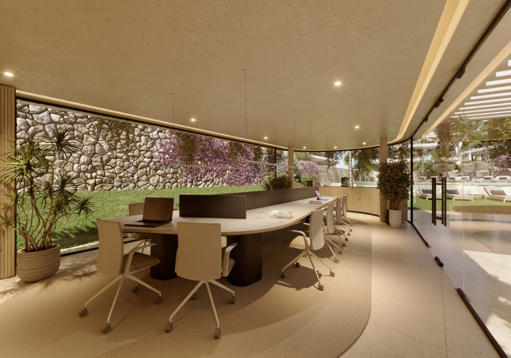 This development offers resort-style amenities, discreetly integrated into the landscape. A tranquil spa hidden behind flowering stone walls, a serene coworking space with garden views and filtered light, and a fitness suite where glass walls reveal trees instead of treadmills.