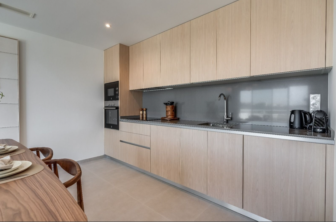 Wnętrze obejmuje jasną, otwartą część dzienną z jadalnią, w pełni wyposażoną kuchnię oraz duże przesuwne drzwi prowadzące na taras o powierzchni 20 m² od strony południowej – idealny do relaksu lub spotkań towarzyskich przy widoku na otwarty ogród i basen.