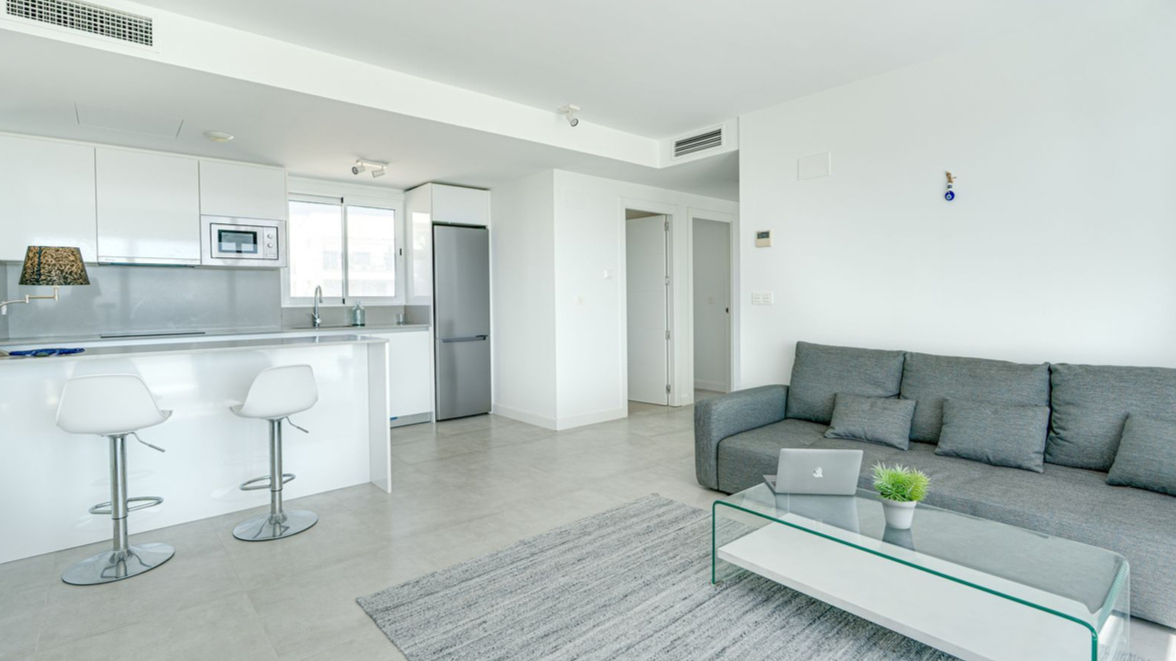 Ten zadbany penthouse oferuje jasną, otwartą przestrzeń dzienną z aneksem kuchennym oraz przestronny taras z niczym nieprzesłoniętym, panoramicznym widokiem na morze.
