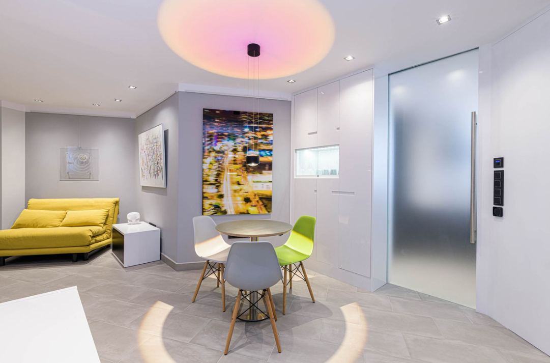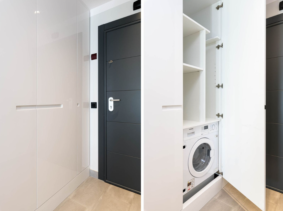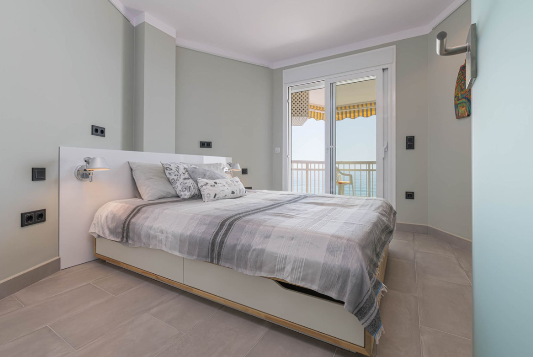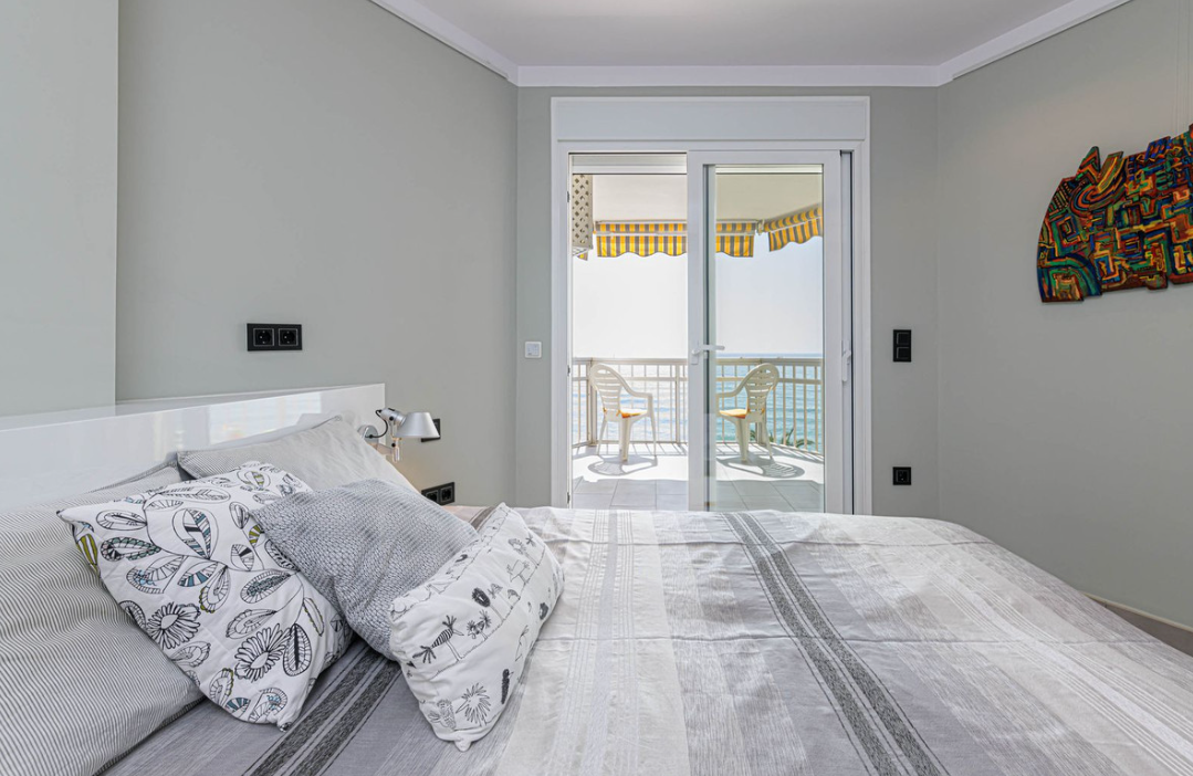 Jadalnia z przylegającym salonem, przesuwane drzwi na taras. Przestronna sypialnia z przesuwanymi drzwiami na taras. Zastosowano najlepsze materiały, zarówno w przypadku szafek kuchennych, sprzętu AGD, blatu, jak i oświetlenia. Nowe podłogi w całym mieszkaniu, najwyższej jakości drzwi przesuwne odporne na wysokie i niskie temperatury. Nieskazitelny widok na morze w promieniu 180 stopni.