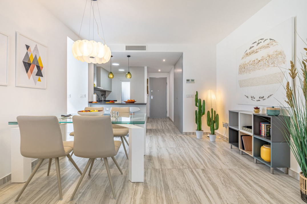 The apartment features two spacious bedrooms and two bathrooms. The modern kitchen is fully equipped with high-quality appliances and also includes a practical utility room. The living room is bright and airy, with large windows and sliding doors that open onto a generous balcony – ideal for relaxing or entertaining.
