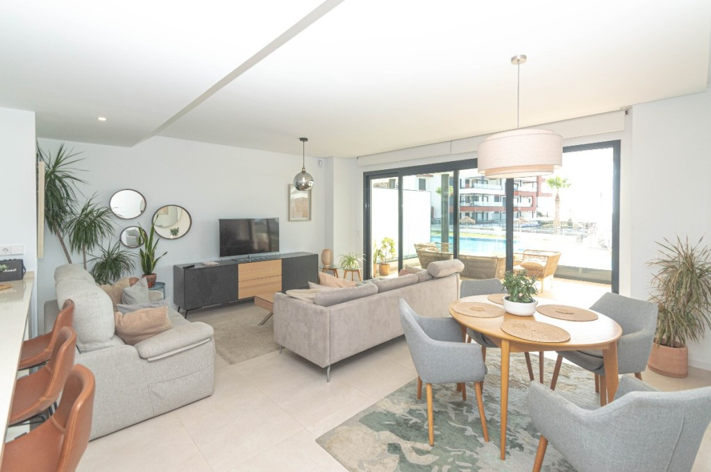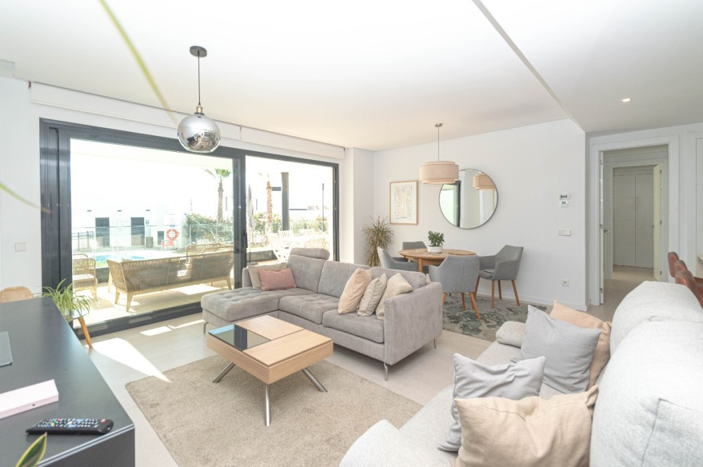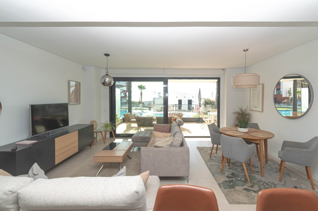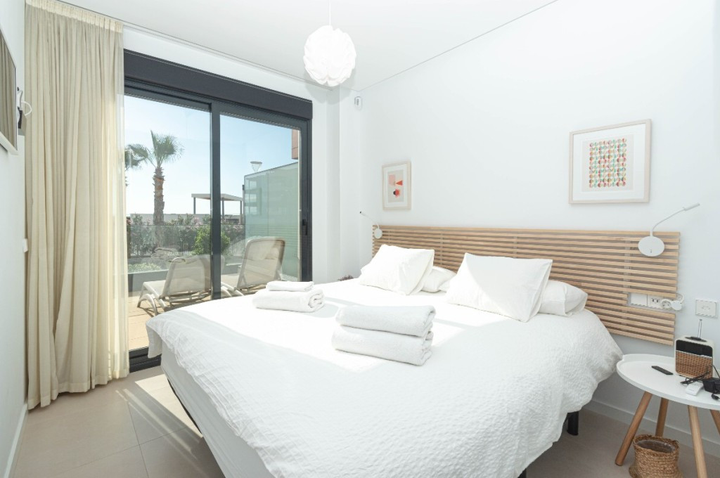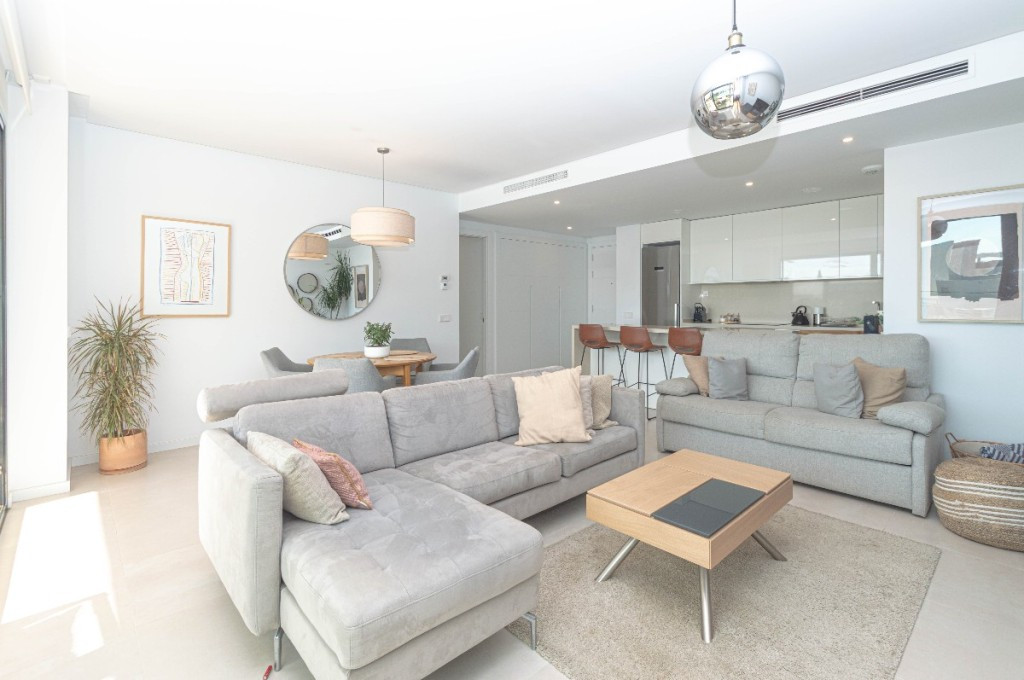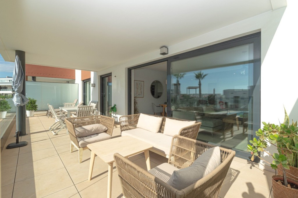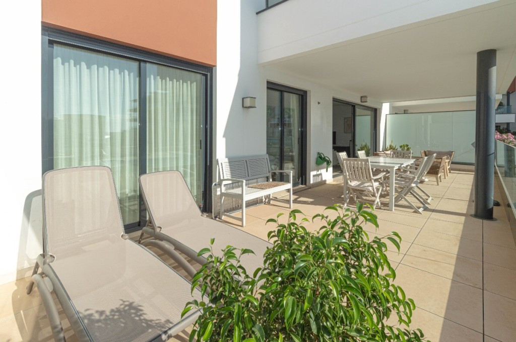 Zarówno salon, jak i 2 sypialnie mają bezpośredni dostęp do dużego tarasu o powierzchni 40 m2, którego część jest zadaszona stołem jadalnym, a druga część jest idealna do opalania.
