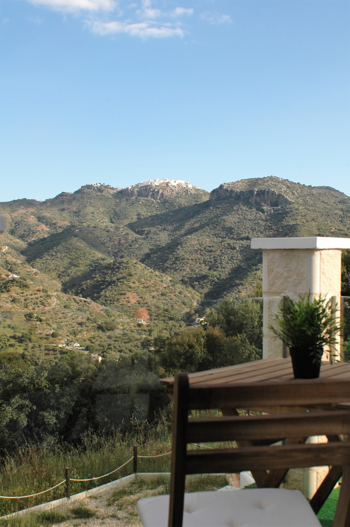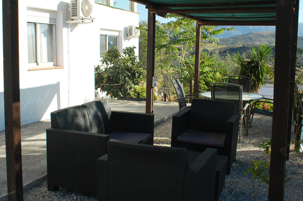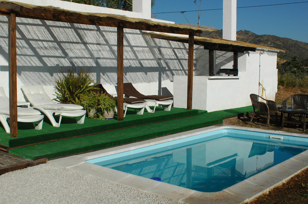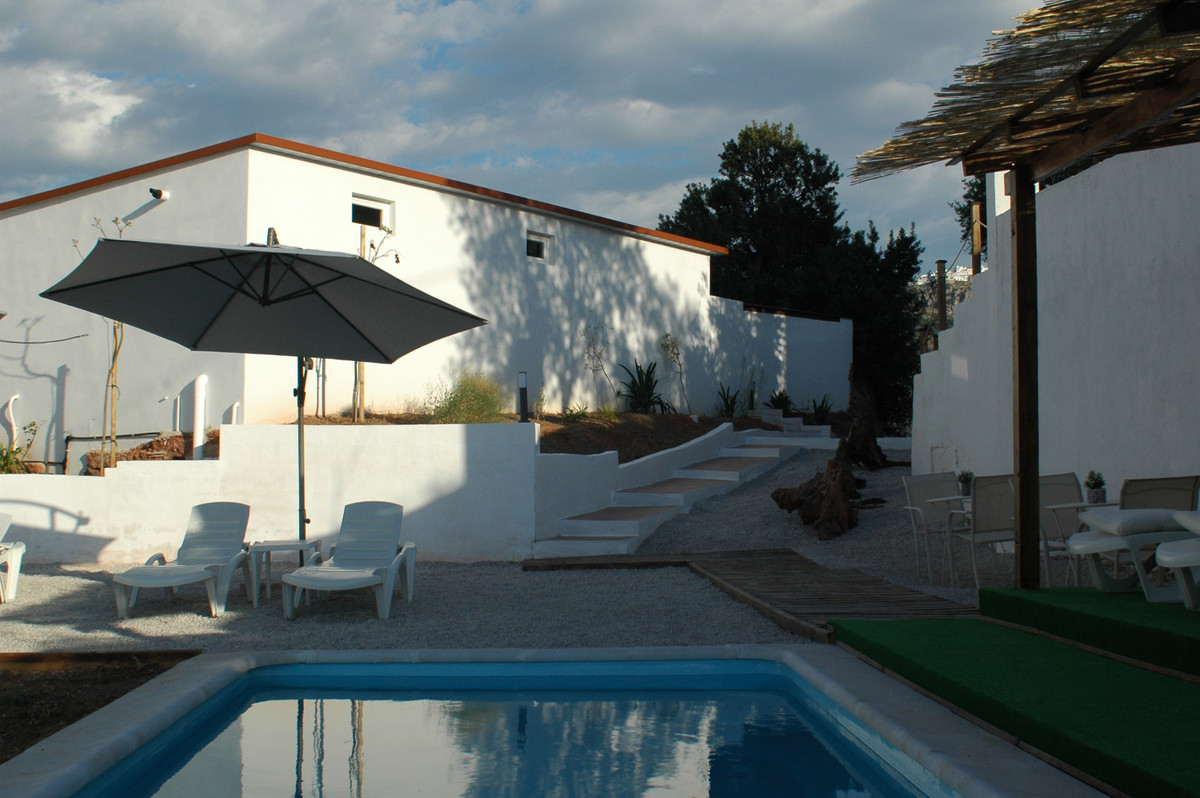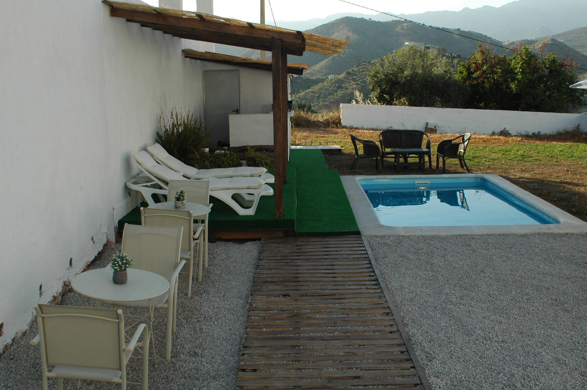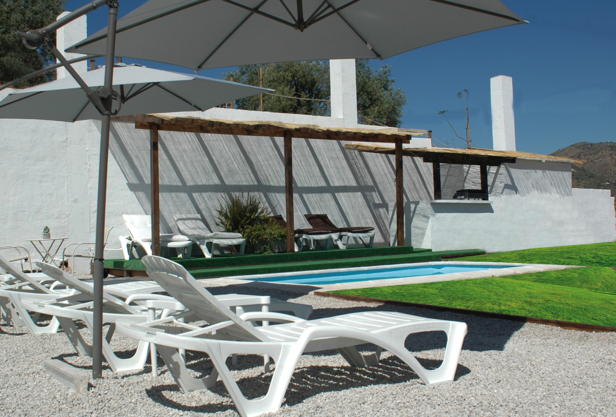Na zewnątrz znajduje się basen, kilka terenów zielonych, drzewa oliwne, drzewa cytrynowe i niesamowite widoki na Comares i góry. Posiada również kilka pomieszczeń gospodarczych i zadaszony garaż.