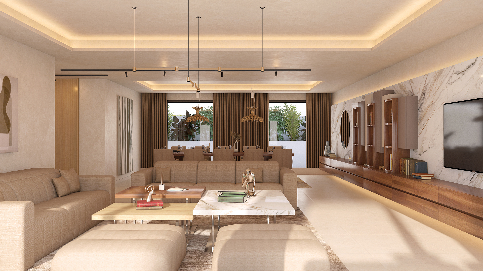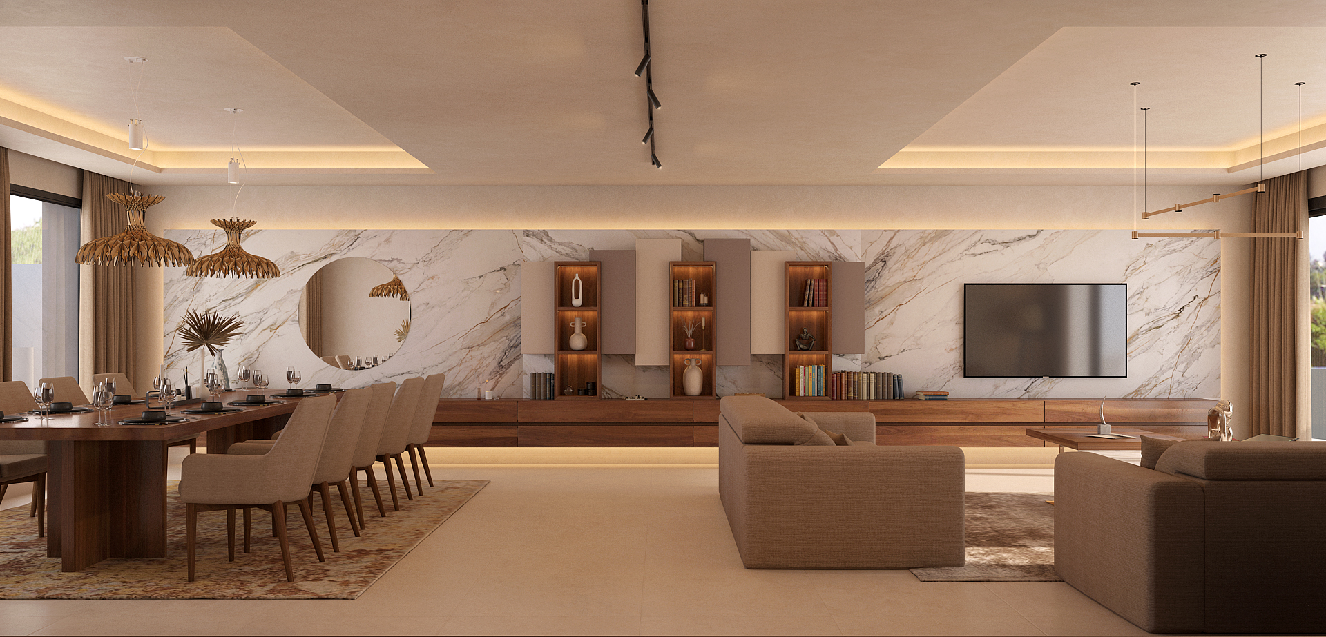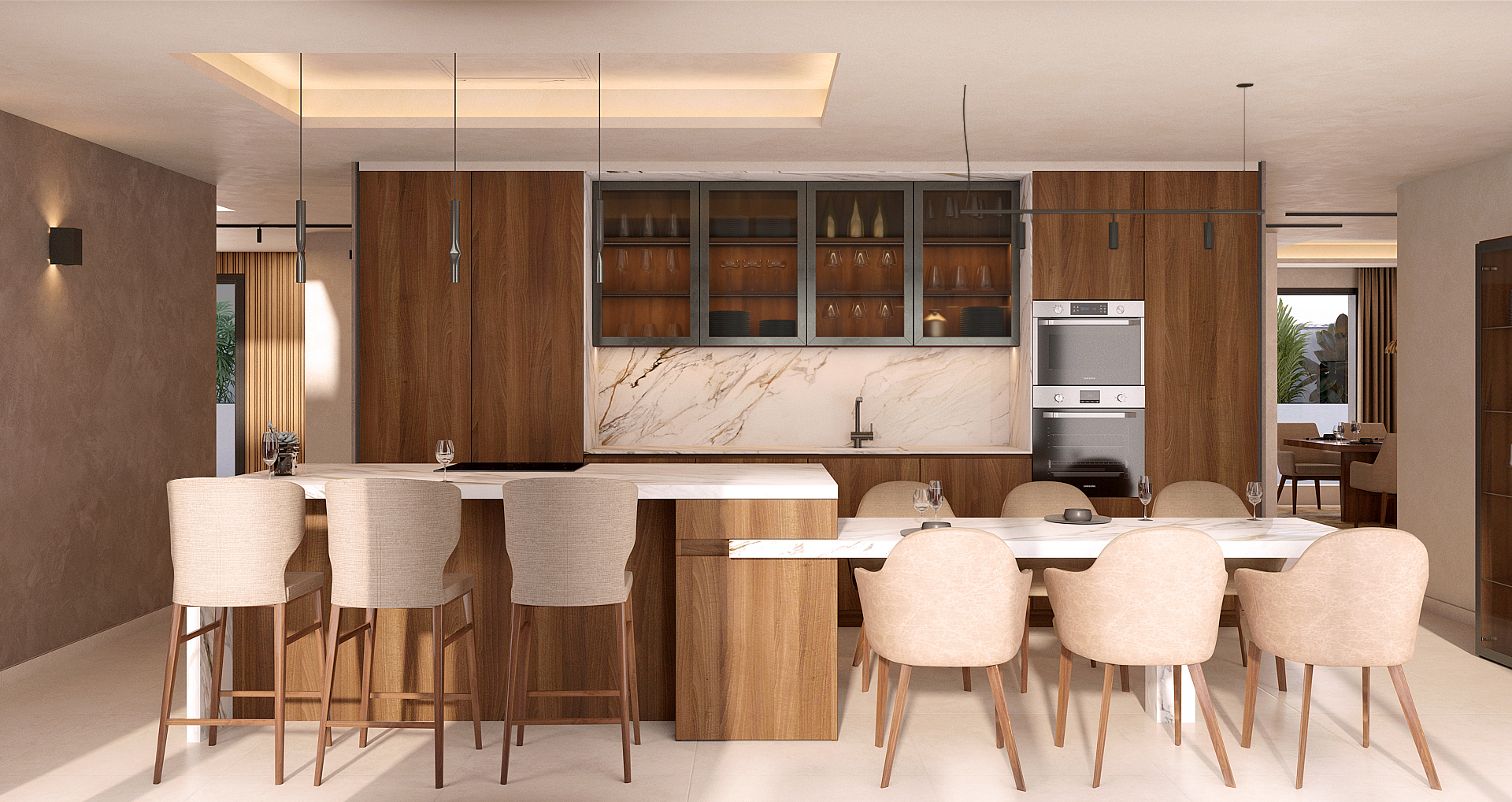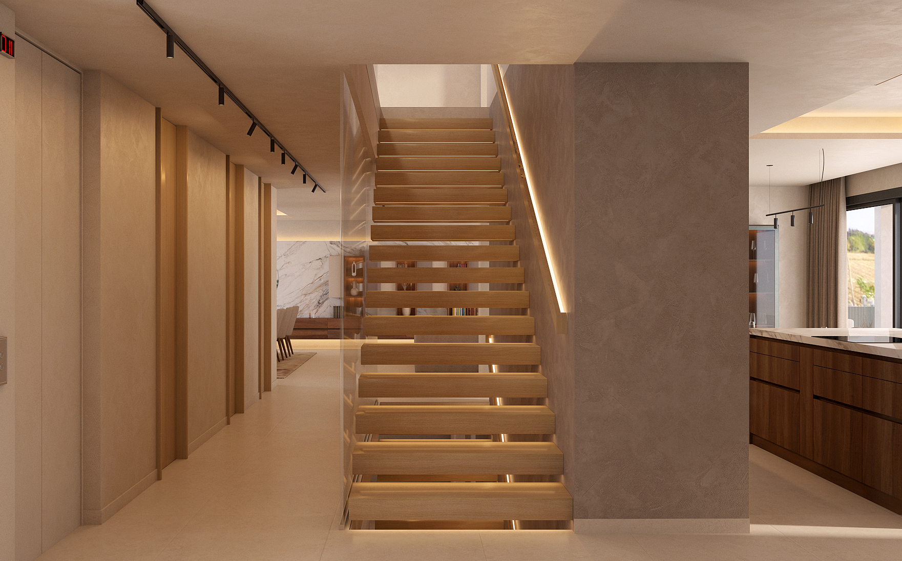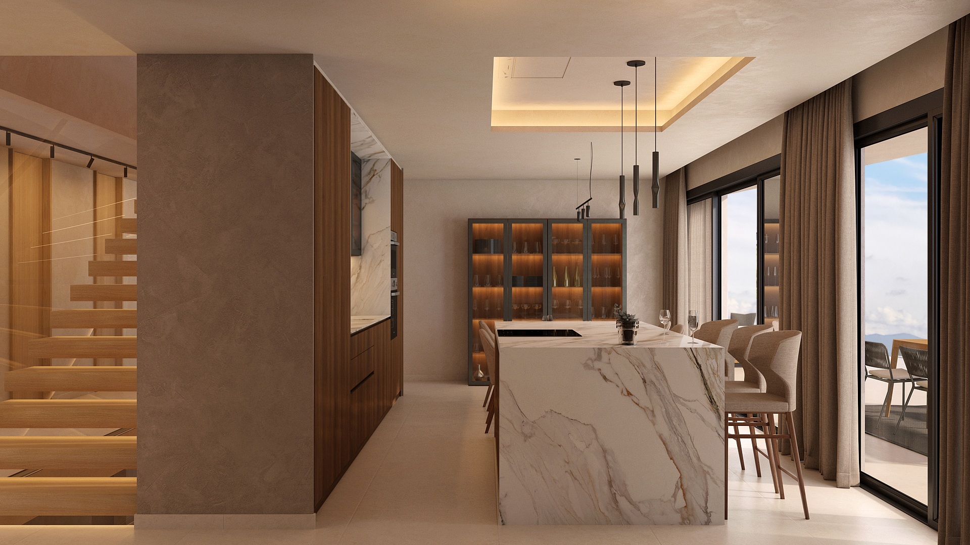 pokój i kuchnie, które są skierowane w stronę basenu na piękne widoki. Również na tym piętrze będzie jedna sypialnia z łazienką, garderoba dla gości, magazyn i spiżarnia.