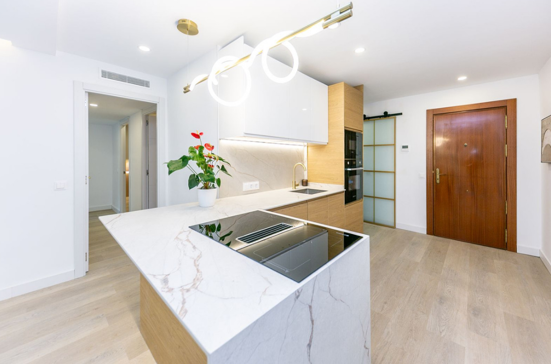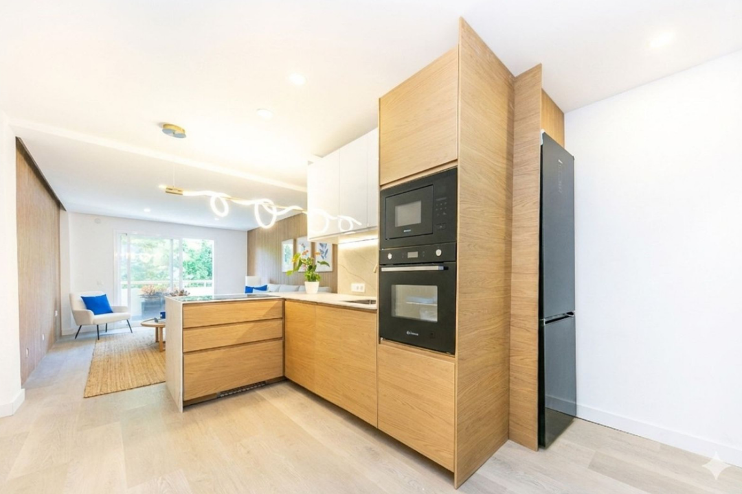Kuchnia jest w pełni umeblowana i wyposażona w nowe urządzenia oraz zintegrowaną zmywarkę, a także oddzielną pralnię oddzieloną szklanymi drzwiami, zapewniającą światło i wizualną ciągłość.