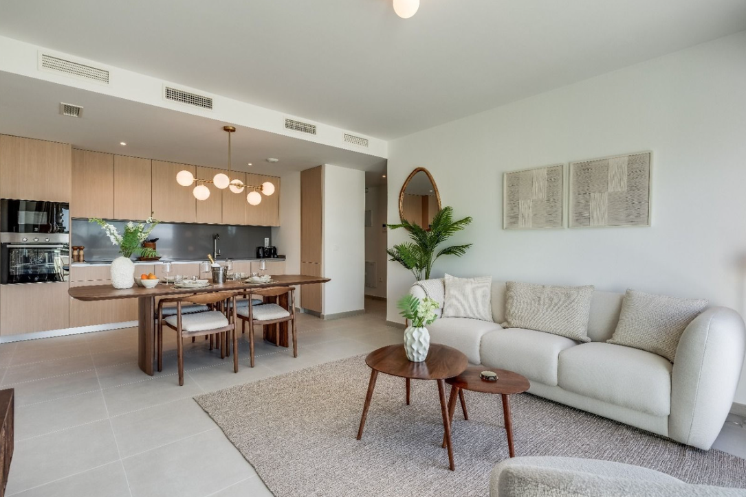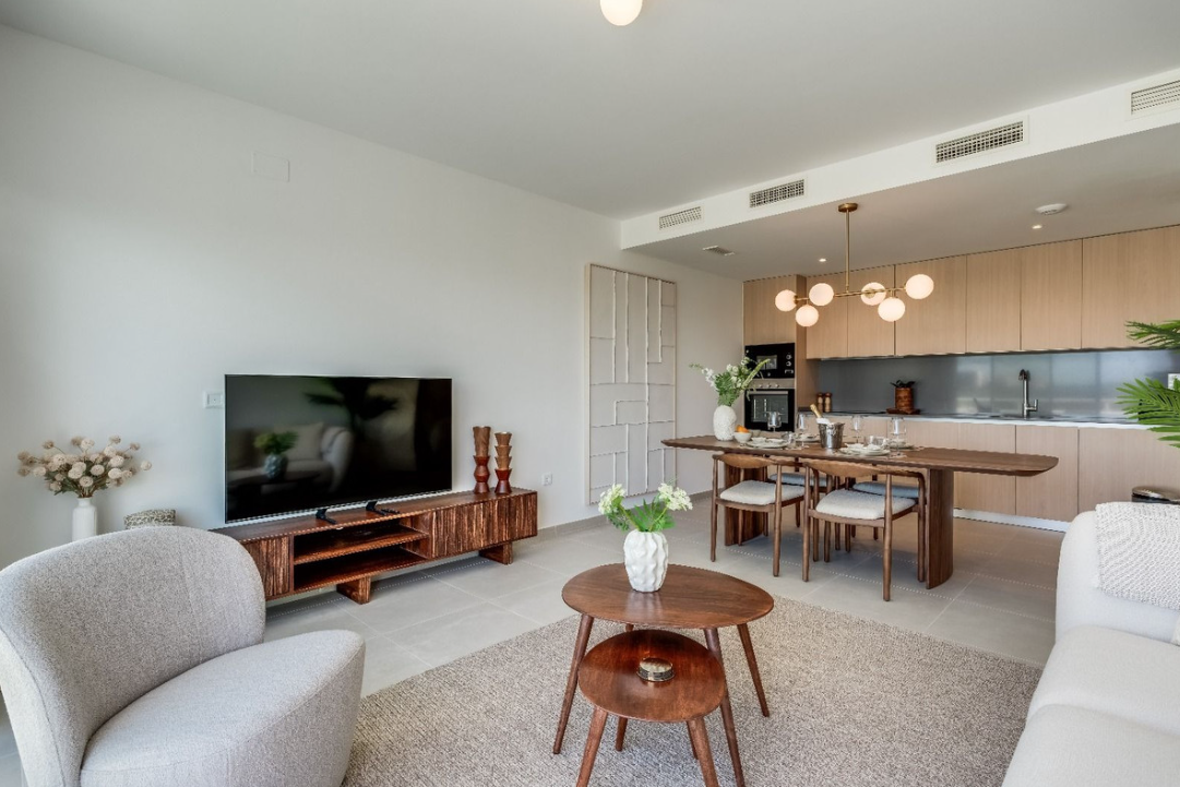 The interior features a bright open-plan living and dining area, a fully fitted kitchen, and large sliding doors leading to a 20 m² south-facing terrace – ideal for relaxing or entertaining while enjoying open garden and pool views.