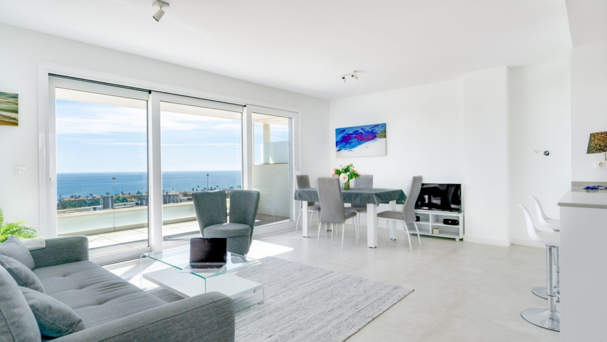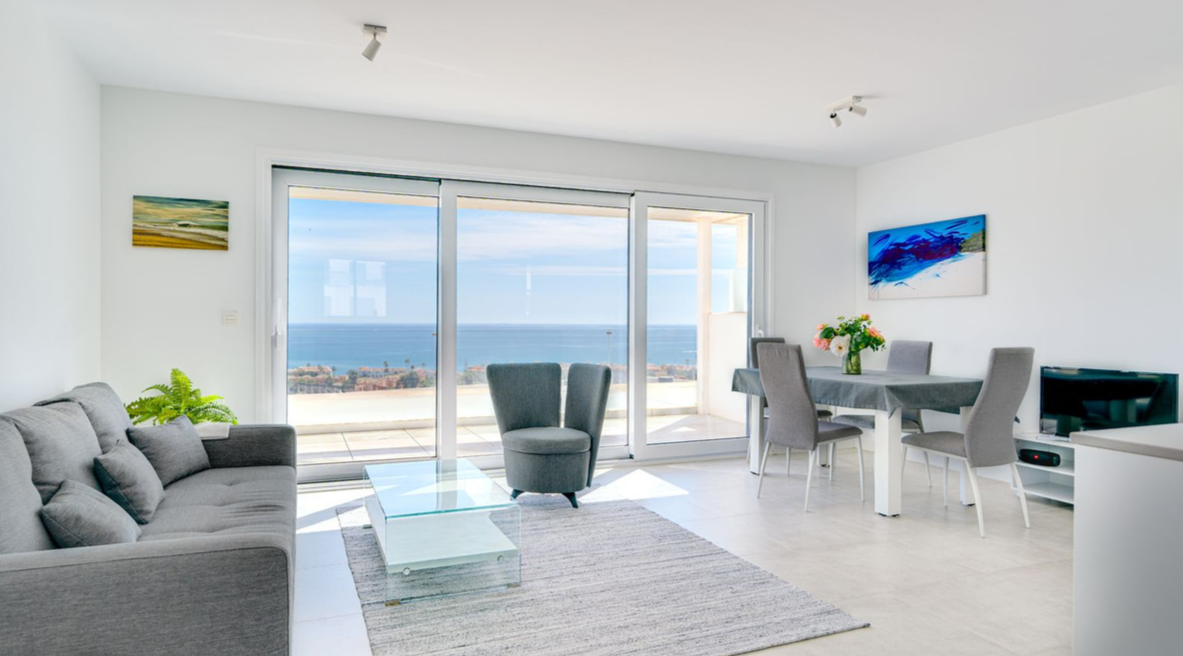 Ten zadbany penthouse oferuje jasną, otwartą przestrzeń dzienną z aneksem kuchennym oraz przestronny taras z niczym nieprzesłoniętym, panoramicznym widokiem na morze.