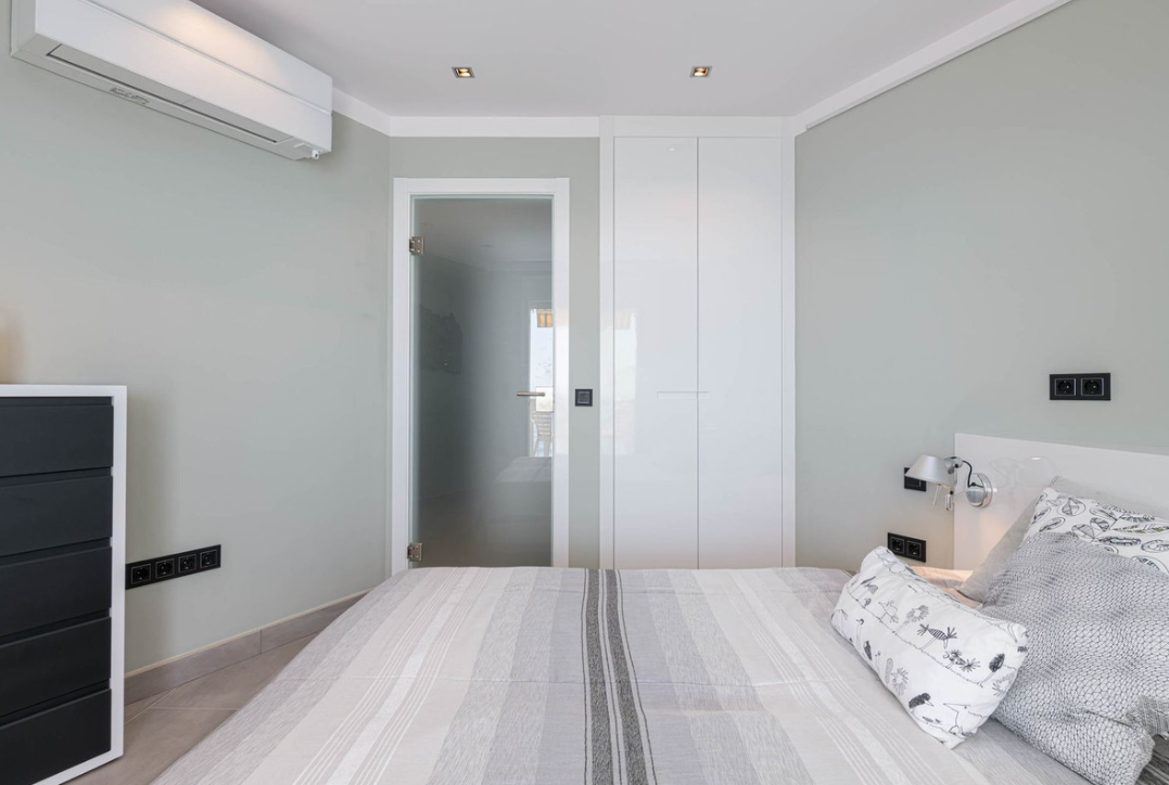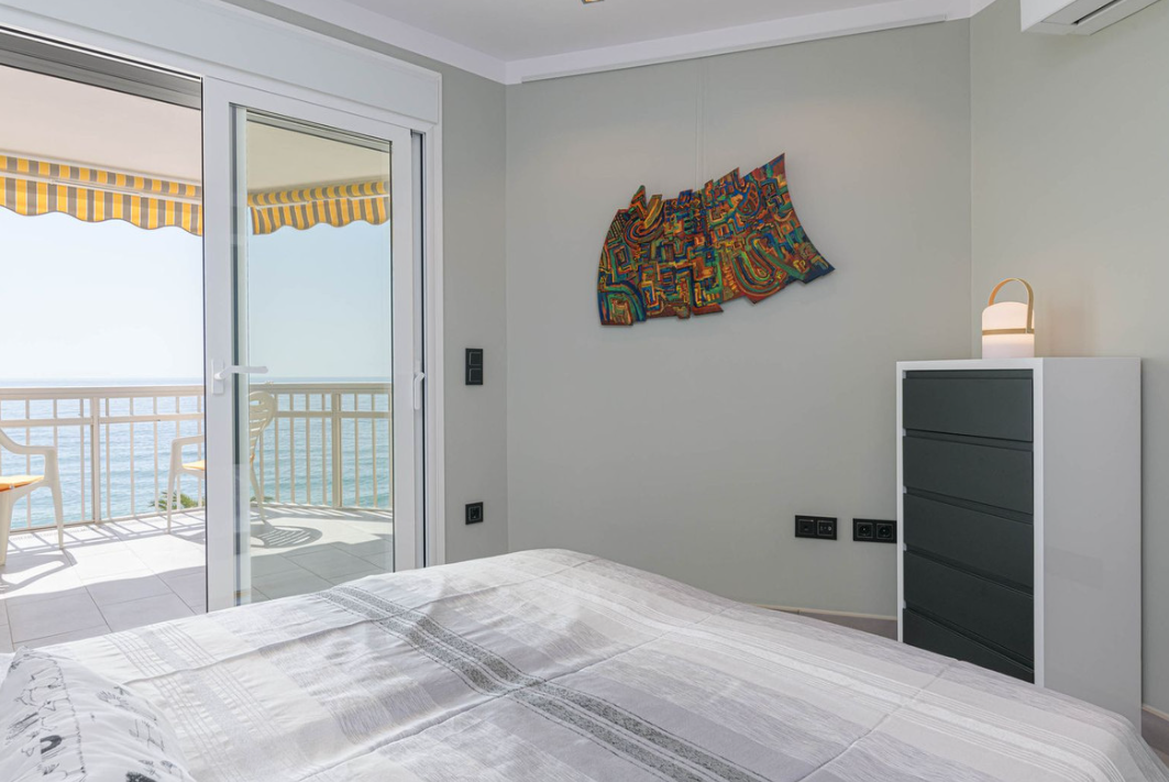 Jadalnia z przylegającym salonem, przesuwane drzwi na taras. Przestronna sypialnia z przesuwanymi drzwiami na taras. Zastosowano najlepsze materiały, zarówno w przypadku szafek kuchennych, sprzętu AGD, blatu, jak i oświetlenia. Nowe podłogi w całym mieszkaniu, najwyższej jakości drzwi przesuwne odporne na wysokie i niskie temperatury. Nieskazitelny widok na morze w promieniu 180 stopni.