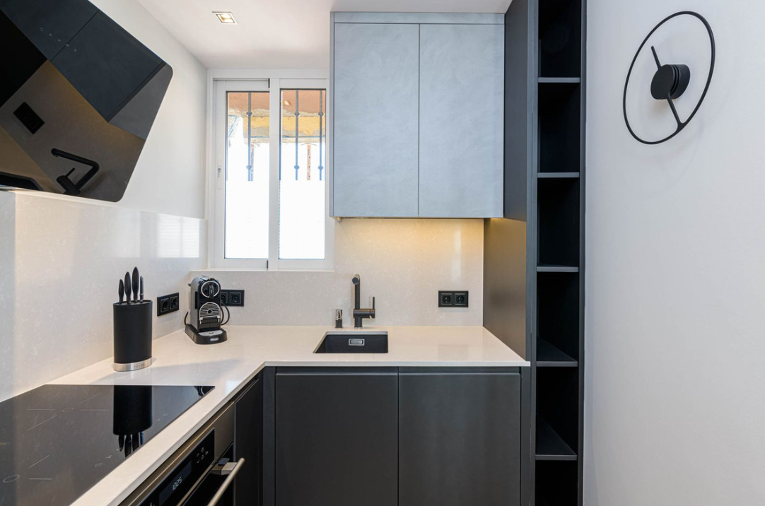 przestronny hol wejściowy z bezpośrednim widokiem na morze, nowa i nowoczesna kuchnia z własnym oknem, łazienka z prysznicem i małym oknem.