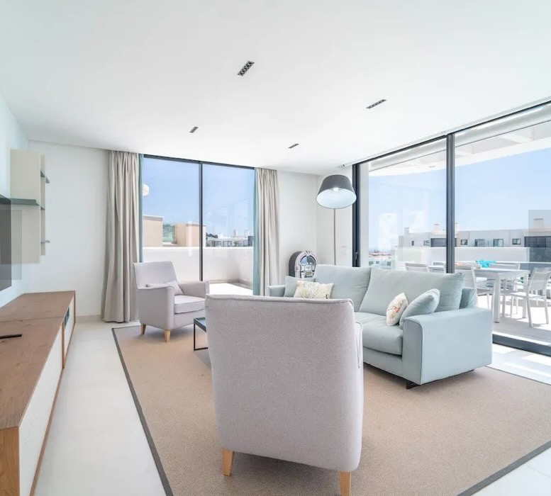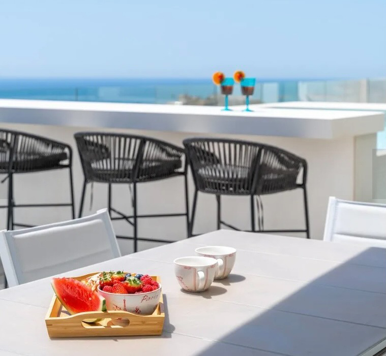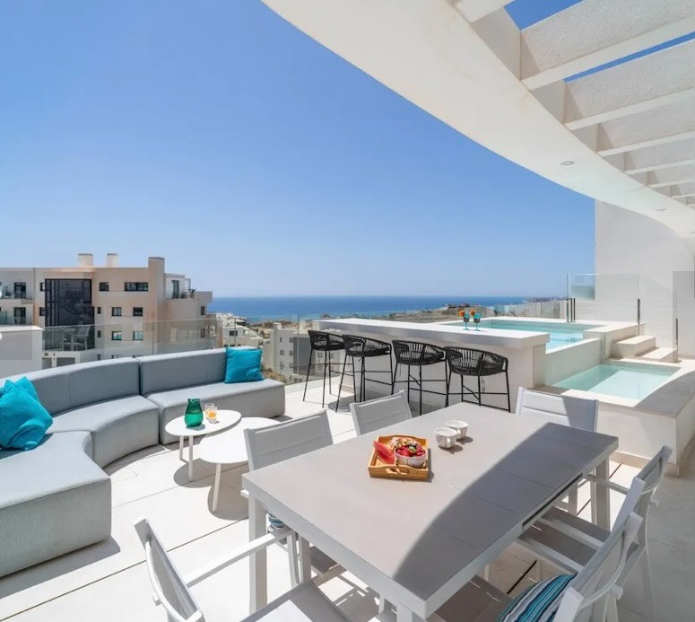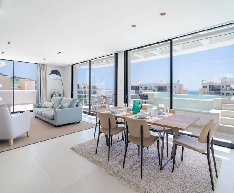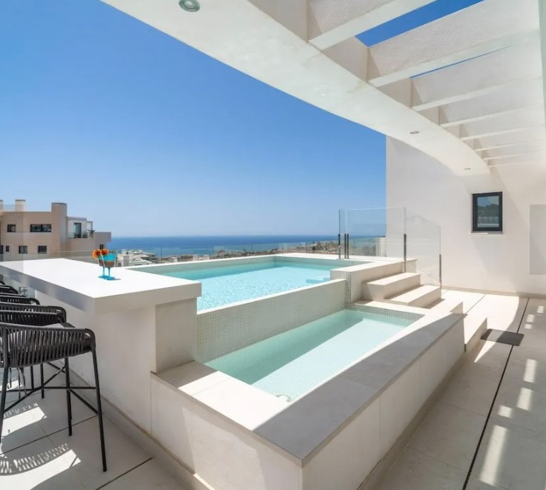 Nowoczesny panoramiczny apartament z dużym tarasem na którym mieści się prywatny basen, miejsca rekreacyjne wyposażone w wygodne meble tarasowe, leżaki oraz bar obok basenu.