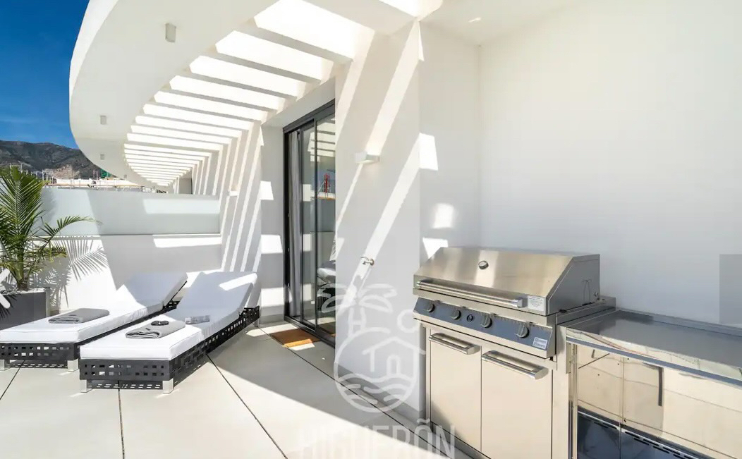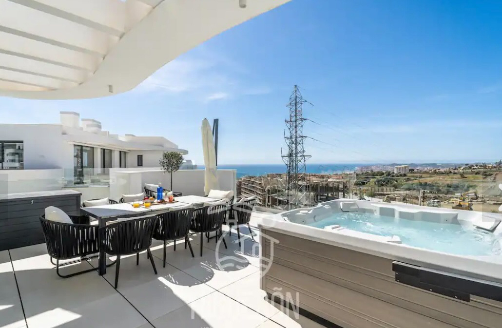 Nowoczesny panoramiczny apartament z dużym tarasem na którym mieści się prywatne jacuzzi , miejsca rekreacyjne wyposażone w wygodne meble tarasowe, leżaki.